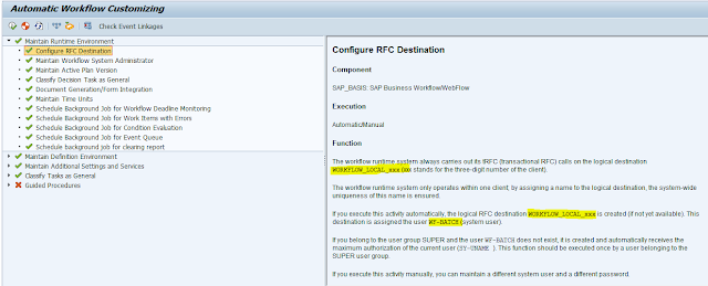 - SAP Documentation states that we need a logical RFC destination with name as – WORKFLOW_LOCAL_XXX (XXX – client number) and which uses WF-BATCH (system user).